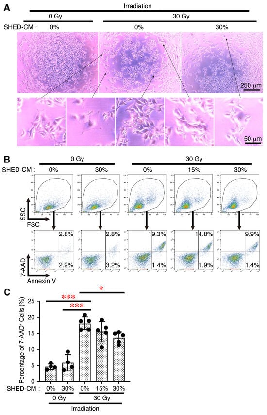 We next explored the effects of SHED-CM on X-ray irradiation-induced cell death, which is highly mediated by the generation of ROS, in mouse melanoma cell line B16F10 cells. After the pre-incubation of B16F10 cells with control medium or SHED-CM, their susceptibility to X-ray irradiation-induced cell death was determined through staining with annexin V and 7-AAD. A visual analysis of the apparent appearance under a microscope revealed that X-ray irradiation greatly increased the number of necrotic-like dead cells in control medium (Figure 3A). In contrast, SHED-CM greatly reduced the number of such necrotic-like dead cells. Moreover, FACS analysis revealed that X-ray irradiation greatly increased the percentage of necrotic cells positive for 7-AAD in B16F10 cells pre-incubated with control medium (Figure 3B,C). In contrast, the pre-incubation of B16F10 cells with SHED-CM significantly reduced the percentage of 7-AAD+ necrotic cells in a dose-dependent manner. These results suggest that SHED-CM protects B16F10 cells from cell death caused by X-ray irradiation.