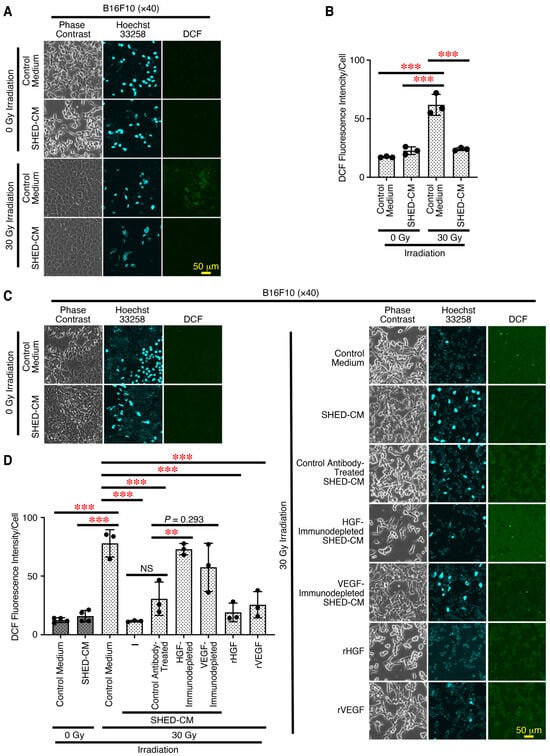 SHED-CM inhibits ROS generation caused by X-ray irradiation in an HGF- and probably VEGF-dependent manner. Mouse melanoma B16F10 cells were pre-incubated with control medium or 30% SHED-CM (A,B), control antibody-treated SHED-CM, HGF- or VEGF-immunodepleted SHED-CM, rHGF (10 ng/mL), rVEGF (10 ng/mL) (C,D) for 3 h. These cells were then treated with DCFDA, irradiated by 30 Gy X-ray, and counterstained with Hoechst 33258. Representative photographs of the ROS generation are shown (A,C). The fluorescence intensity of DCF and Hoechst 33258 was quantified using FIJI and calculated as arbitrary units per cell (B,D). Data are shown as the mean ± SD (n = 3), and are representative of two independent experiments. p-values were determined by one-way analysis of variance with Tukey’s multiple comparisons test. ** p < 0.01, *** p < 0.001. NS, not significant.