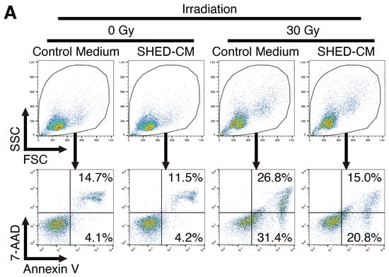 B16F10 cells (4 × 104) were seeded onto a 24-well plate in complete DMEM supplemented with 10% FBS and incubated overnight. The cells were then pre-incubated with 30% SHED-CM (5% FBS) or control medium (5% FBS), N-acetyl-L-cysteine (NAC) for 3 h, irradiated by X-ray (30 Gy), and incubated for a further 1 or 24 h. Then, the cells were stained using FITC Annexin V Apoptosis Detection Kit with 7-amino-actinomycin D (7-AAD, BioLegend, San Diego, CA, USA), according to the manufacturer’s protocol. Annexin V+ population and 7-AAD+ population were detected with a FACSCanto II flow cytometer (BD Biosciences, San Diego, CA, USA) and analyzed using the FlowJo software (version 10: FlowJo).