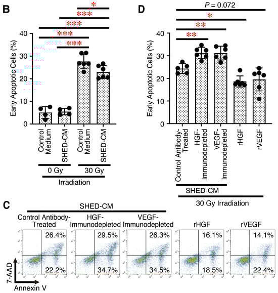 Finally, we explored the role of HGF and VEGF in the protective effects of SHED-CM against cell death caused by X-ray irradiation in B16F10 cells. After pre-incubation of B16F10 cells with control medium or SHED-CM, control antibody-treated SHED-CM, HGF- or VEGF-immunodepleted SHED-CM, rHGF, and rVEGF, their susceptibilities to 30 Gy X-ray irradiation-induced cell death were determined 24 h after irradiation by staining with annexin V and 7-AAD, followed by FACS analysis. X-ray irradiation greatly increased the percentage of early apoptotic cells positive for 7-AAD but negative for annexin V in B16F10 cells pre-incubated with control medium (Figure 5A,B). In contrast, the pre-incubation of B16F10 cells with SHED-CM slightly but significantly reduced the percentage of early apoptotic cells (Figure 5A,B). Moreover, the depletion of HGF or VEGF from SHED-CM significantly increased the percentage of early apoptotic cells (Figure 5C,D). Consistent with these results, rHGF or rVEGF significantly or almost significantly reduced the percentage of early apoptotic cells, respectively (Figure 5C,D). These results suggest that SHED-CM protects B16F10 cells from cell death caused by X-ray irradiation in an HGF- and VEGF-dependent manner.