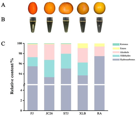 The relative content and composition of five CPEOs. (A) Phenotype of five citrus fruits. (B) The colors of the five CPEOs. (C) The differences in the relative content and composition of five EOs components. FJ: FengJieQiCheng peel essential oil; JC26: JinCheng26 peel essential oil; STJ: ShaTangJu peel essential oil; XLB: XingLuBiXiYou peel essential oil; and RA: RongAnJinDan fruit peel essential oil.