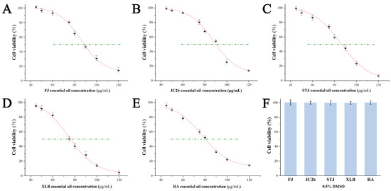 Effect of five CPEOs on the growth of U251 cells. (A–E) U251 cells were treated with various concentrations of FJ, JC26, STJ, XLB, and RA EOs for 24 h. (F) The control was treated with 0.5% DMSO. The data represent the mean ± SD. The green dashed line indicated a cell viability rate of 50%.