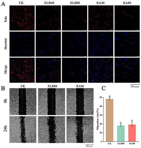 Effect of the CPEOs on proliferation and migration in U251 cells. (A) XLB and RA EOs can inhibit cell proliferation. Proliferating cells and cell nuclei were stained with BeyoClick™ EdU-555 kit and Hoechst 33342. (B) The cell migration ability of U251 cells was determined using the wound healing assay, where the cells were treated with XLB and RA EOs in serum-free medium for 24 h. (C) Statistical data of migration rate (%). The concentrations of XLB40 and RA40 were 40 µg/mL, while those of XLB80 and RA80 were 80 µg/mL. CK was treated with 0.5% DMSO. The data represent the mean ± SD. Values followed by different superscripts (a,b) are significantly different (p < 0.05).