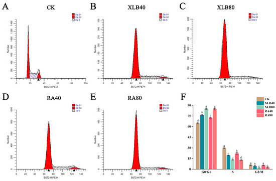 The effects of the CPEOs on the cell cycle were investigated via PI staining experiments (Figure 4). The results revealed that after 24 h of treatment with XLB and RA, the number of cells in the S phase decreased significantly, whereas the number of cells in the G1/G0 phase increased significantly, with the most pronounced effect observed at 80 µg/mL. Specifically, the proportions of cells in the S phase decreased by 10.03% and 16.32% in the XLB40 and XLB80 groups, respectively, whereas the proportions of cells in the G1/G0 phase increased from 65.07% ± 1.18% to 76.40% ± 1.09% and 85.13% ± 0.66%, respectively. Compared with that in the CK group, in the RA40 and RA80 groups, the proportions of cells in the S phase decreased by 7.42% and 16.34%, respectively, while the proportions of cells in the G1/G0 phase increased by 7.41% and 19.32%, respectively. These findings indicate that the CPEOs dose-dependently impeded the transition of U251 cells from the G1/G0 phase to the S phase, inducing G1/G0 arrest and reducing the number of cells in the S phase (Figure 4F).