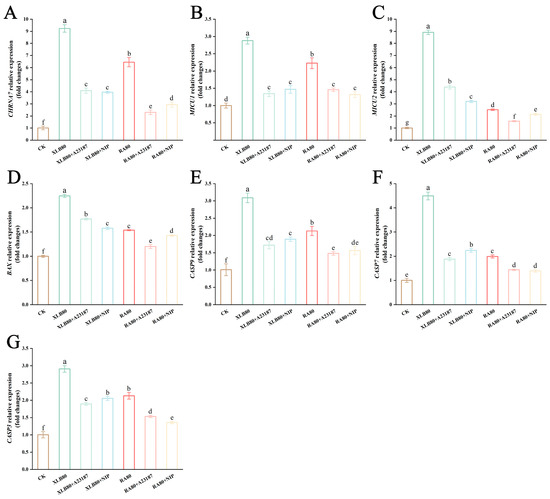 Effect of the CPEOs on the expression of the CHRNA7 (A), MICU1 (B), MICU2 (C), BAX (D), Caspase-9 (E), Caspase-7 (F), and Caspase-3 (G) in U251 cells. XLB80 = 80 µg/mL, RA80 = 80 µg/mL, XLB80 + A23187, XLB80 + NIP, RA80 + A23187, and XLB80 + NIP represents pretreatment with 10 µM of A23187 and NIP for 1.5 h before adding XLB and RA EOs. The data are presented as mean ± SD. Values followed by different superscripts (a–g) are significantly different (p < 0.05).
