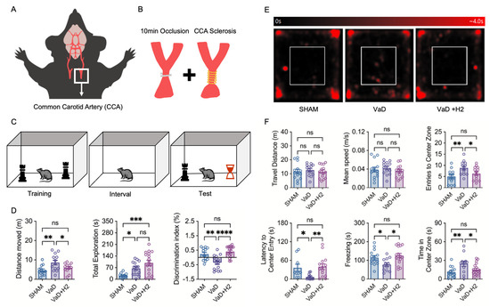 A mouse model of vascular dementia (VaD) and its cognitive and behavioral assessments using novel object recognition (NOR) and open field (OF) tests. (A,B) Surgical procedures for establishing the VaD model, including bilateral common carotid artery (BCCA) occlusion (10 min) and sclerosis, are illustrated. (C) In the NORT procedure, following a training session with identical objects, the mouse is placed into an empty chamber during the interval and then tested with both a familiar and a novel object to assess recognition memory. (D) In the NORT, VaD mice traveled greater distances within the chamber, which was restored by H2 treatment. On the other hand, object exploration was greatest in the H2-treated group. Object discrimination, measured by the discrimination index, was impaired in VaD mice and restored to near Sham levels by H2 treatment. ns = not significant; * p < 0.05; ** p < 0.01; *** p < 0.001; **** p < 0.0001. (E) A heat map of OFT results shows the mice’s movement, with red indicating prolonged time spent in a single location. (F) Although no differences in travel distance or mean speed were observed between groups, center zone entries were significantly higher in VaD mice. Additionally, VaD mice exhibited reduced latency to center entry and decreased freezing behavior, alongside increased time spent in the center zone. ns = not significant; * p < 0.05; ** p < 0.01.