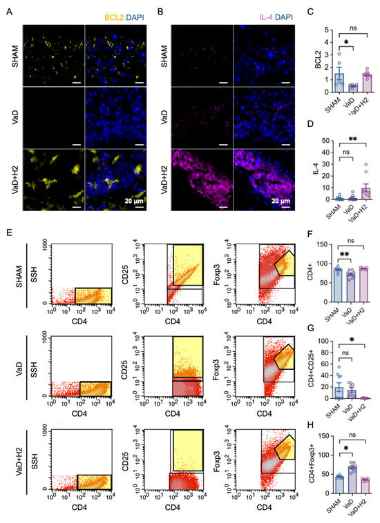 Immunofluorescence images of Bcl-2 and IL-4 expression in the hippocampus and flow cytometry analyses of Treg pathway activation. (A,B) Representative immunofluorescence images show Bcl-2 (yellow) and IL-4 (magenta) expression, with nuclei stained by DAPI (blue). (C,D) Quantitative analyses of Bcl-2 and IL-4 expression levels are presented as bar graphs. ns = not significant; * p < 0.05; ** p < 0.01. (E) Flow cytometry gating strategy for identifying CD4+, CD4+CD25+, and CD4+Foxp3+ T cells (indicated by yellow regions). (F–H) Flow cytometry results demonstrate that CD4+ cell counts were significantly decreased in the VaD group but restored by H2 treatment. In contrast, CD4+CD25+ cells were significantly lower in the H2-treated group, while CD4+Foxp3+ cells were significantly higher in the VaD group than in the other groups. ns = not significant; * p < 0.05; ** p < 0.01.