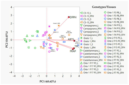 To analyze comprehensively the changes in antioxidant activities influenced by genotype and different plant tissues, a principal component analysis (PCA) was performed on the entire dataset (data obtained from four antioxidant assays in 40 methanolic extracts). Specifically, the PCA was conducted to identify the representative genotypes and tissues within each of the three genotype groups (Orte 1 and Orte 2 populations, and reference genotypes) that exhibited the most significant antioxidant activities (FRAP, ABTS, DPPH) and total phenolic content (TPC).