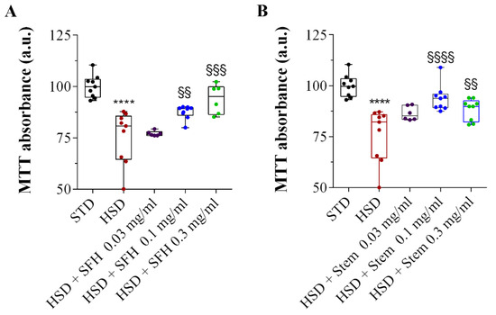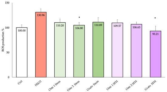 To evaluate the ability of stem and SFH extracts from the three different genotypes to protect against oxidative stress, five no-cytotoxic concentrations diluted one to two were used (0.39 to 6.25 µg/mL for stem extracts and 12.5 to 200 µg/mL for SFH extracts). After 24 h, oxidative stress was induced by exposing the cells to 700 μM H2O2 for 1 h. Cell viability was then assessed by measuring MTT reduction, as previously described.