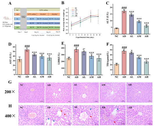BC99 improved the liver injury of AALI rats. (A) Experiment design, (B) changes in body weight of rats, (C) plasma ALT level, (D) plasma AST level, (E) plasma LDH level, (F) plasma TBA level, (G) liver H&E staining, magnification 200×, (H) liver H&E staining, magnification 400×. The blue arrow represents disordered cell arrangement, while the red arrow represents cell necrosis. ### p < 0.001 vs. the NC group. * p < 0.05, *** p < 0.001 vs. the AD group.