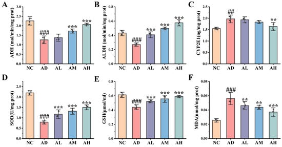 BC99 reduced liver oxidative stress injury in AALI rats. (A) Liver ADH activity. (B) Liver ALDH activity. (C) Liver CYP2E1 level. (D) Liver SOD activity. (E) Liver GSH content. (F) Liver MDA content. ## p < 0.01, ### p < 0.001 vs. the NC group. ** p < 0.01, *** p < 0.001 vs. the AD group.