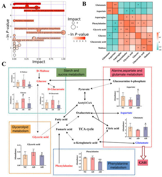 In order to better understand biomarkers, we focused on the analysis of differential metabolites between the AD group and AH group. We conducted enrichment analysis and topological analysis to identify the key pathway with the highest correlation with metabolite differences. The results showed that BC99 improved the dysregulated metabolic profiles induced by alcohol through various metabolic pathways (Figure 4A). Among them, seven pathways with influencing factors > 0.1 are alanine, aspartate and glutamate metabolism, Starch and sucrose metabolism, Phenylalanine, tyrosine and tryptophan biosynthesis, D-Glutamine and D-glutamate metabolism, Ascorbate and aldarate metabolism, Phenylalanine metabolism, Glycerolipid metabolism. These seven metabolic pathways involve eight different metabolites, including Aspartate, Glutamate, L-Asparagine, Glucose, D-Maltose, D-Glucuronic, Phenylalanine, Glyceric acid. Subsequently, we analyzed the interactions of relevant metabolites and integrated their main metabolic networks (Figure 4B,C). Compared with the AD group, the contents of L-asparagine, glucose, D-maltose, D-glucoronic, phenyllalanine and glycoacid in the AH group decreased significantly, while the contents of aspartate, glutamate increased significantly.
