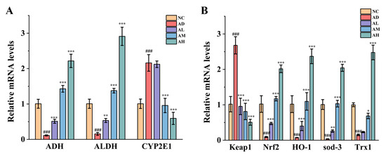 BC99 enhanced the expression of antioxidant-related genes in AALI rats. (A) Expression of genes related to alcohol metabolism. (B) Expression of genes related to Nrf2 pathway. ### p < 0.001 vs. the NC group. * p < 0.05, ** p < 0.01, *** p < 0.001 vs. the AD group.