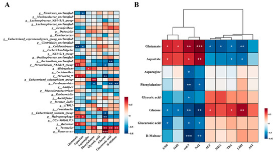 Spearman correlation analysis of differential metabolites. (A) Spearman correlation analysis between liver differential metabolites and intestinal flora. (B) Spearman correlation analysis of differential metabolites and phenotypes. * p < 0.05, ** p < 0.01, *** p < 0.001.