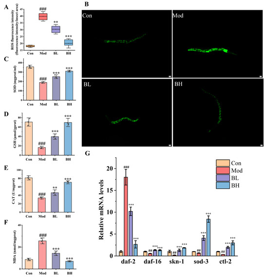 BC99 enhanced the levels of antioxidant-related genes and enzymes in N2 nematodes. (A) Relative fluorescence intensity of ROS in N2 nematodes. (B) Typical images of ROS in N2 nematodes (scale bar 20 μm). (C) SOD activity. (D) GSH content. (E) CAT activity. (F) MDA content. (G) Relative gene expression of antioxidant related genes. ## p < 0.01, ### p < 0.001 vs. the Con group. ** p < 0.01, *** p < 0.001 vs. the Mod group.
