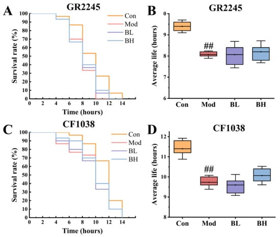 BC99 significantly attenuated the antioxidant stress resistance of GR2245 and CF1038 mutants. (A) GR2245 mutant survival curve. (B) GR2245 mutant average life. (C) CF1038 mutant survival curve. (D) CF1038 mutant average life. ## p < 0.01 vs. the Con group.