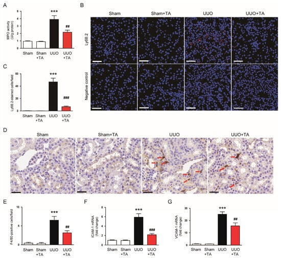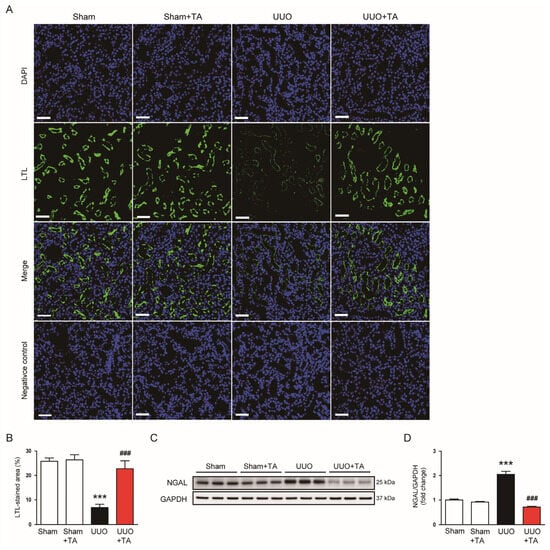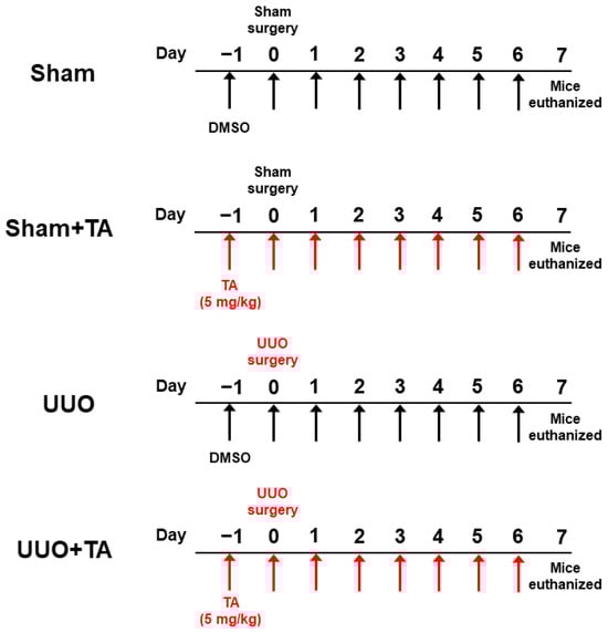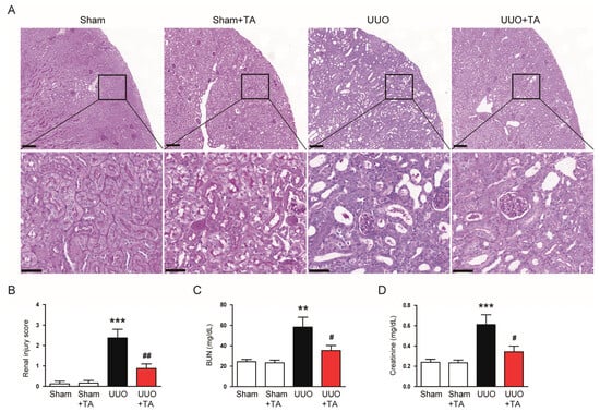 3.1. TA Ameliorates Renal Injury and Preserves Renal Function in a UUO-Induced CKD Model