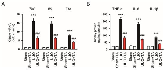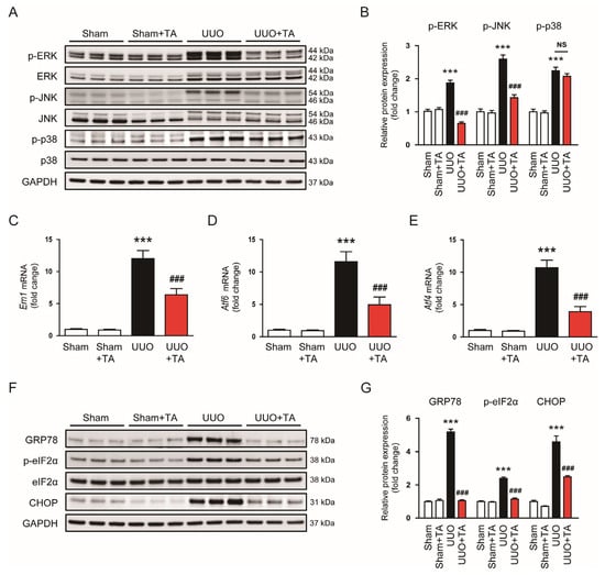 3.2. TA Attenuates Inflammatory Responses, MAP Kinase Pathway Activation, and ER Stress in UUO Mice