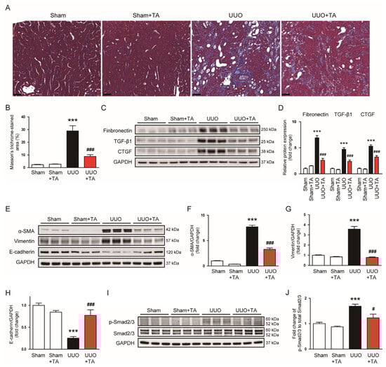 3.3. TA Reduces Fibrosis, Reverses EMT, and Inhibits Smad2/3 Activation in UUO-Induced Kidney Injury