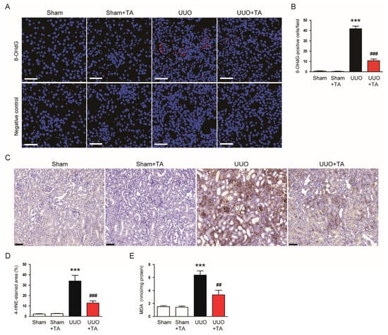 3.4. TA Alleviates Oxidative DNA Damage and Lipid Peroxidation in UUO-Induced Kidney Injury