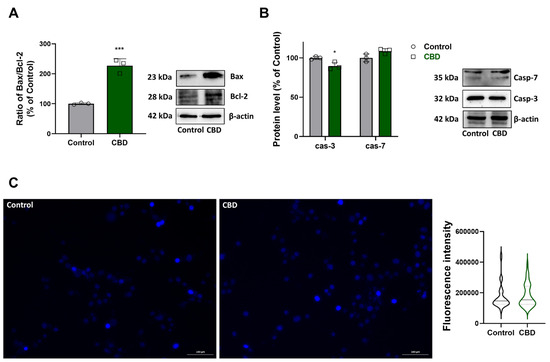 Effects of CBD on the apoptosis pathway. Western blot and densitometric analysis of bands, (A) Bax and Bcl-2. (B) Casp-7 and Casp-3. Values represent relative optical density after normalization to β-actin expression. The results were expressed as a percentage relative to the control group, which was set as the reference at 100%. Results are expressed as mean ± SD. Experiments were repeated three times independently (n = 3). * p < 0.05 and *** p < 0.001 compared with control. (C) DAPI staining in control and CBD conditions (scale bar 100 µm) and graph of single cells fluoresce for at least 60 cells per condition from 3 photos per condition.