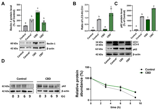 Effect of CBD treatment on autophagic flux. Analysis by Western blotting of Beclin-1 levels (A), the ratio of LC3-II/LC3-I (B), and p62 levels (C). (D) Half-life of p62 in the presence and absence of chloroquine inhibitor, under control and CBD conditions. Values were normalized to β-actin expression. Results are expressed as mean ± SD. The results, except for the ratio, were expressed as a percentage relative to the control group, which was set as the reference at 100%. Experiments were repeated three times independently (n = 3), and samples bearing different letters differ significantly (p < 0.05).