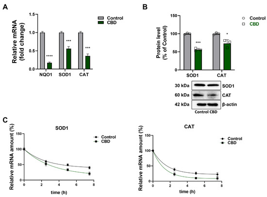Effect of CBD on NRF2 target gene expression levels. (A) Analysis of SOD1, CAT, and NQO1 mRNA abundance normalized against the internal standard GAPDH mRNA. The results were expressed by normalizing the values to the control group, whose mean value was set to 1. (B) Western blot and densitometric analysis with values representing relative optical density after normalization to β-actin expression. (C) Half-life of SOD1 e CAT mRNA after normalization to 18S rRNA. Results are expressed as mean ± SD. The results were expressed as a percentage relative to the control group, which was set as the reference at 100%. Experiments were repeated three times independently (n = 3). * p < 0.05, *** p < 0.001 and **** p < 0.0001 compared with control.