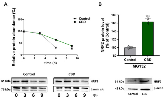Effects of CBD on NRF2 stability. (A) NRF2 half-life measurement after treatment with 100 μM cycloheximide at 0, 3, 6, and 9 h. (B) U87MG cells were pretreated with 20 μM MG132, an inhibitor of the ubiquitin–26S proteasome system. NRF2 levels were normalized with respect to Lamin a/c or β-actin. Results are expressed as mean ± SD. The results were expressed as a percentage relative to the control group, which was set as the reference at 100%. Experiments were repeated three times independently (n = 3). *** p < 0.001 compared with control.
