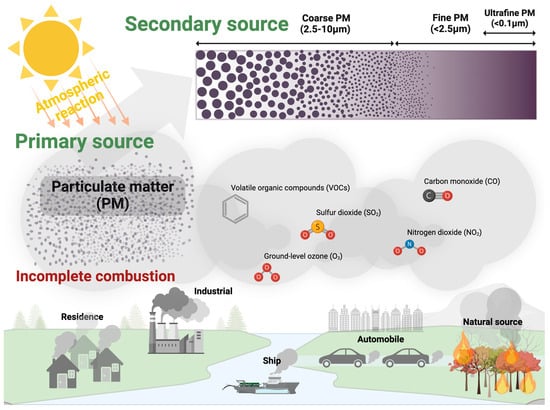 Air pollution, stemming from various sources, is currently a pressing environmental issue affecting diverse populations worldwide. While the health consequences of air pollution have gained global attention since the twentieth century [], ongoing research continues to investigate the specific impacts of particulate matter (PM). Studies have demonstrated that PM exposure can occur through inhalation, skin contact, and ingestion, leading to a range of detrimental effects on the human body.