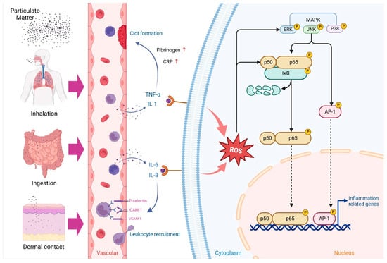 PM exposure can trigger innate immune responses in monocytes and macrophages, leading to the production of reactive oxygen species (ROS) []. This, in turn, induces the release of pro-inflammatory cytokines, such as TNF-α and IL-6, by activated macrophages. These cytokines stimulate endothelial cells, increasing vascular permeability and facilitating the infiltration of immune cells into affected tissues. Cytokines such as interleukin-6 (IL-6) and interleukin-8 (IL-8) further promote leukocyte recruitment through interactions with endothelial cell adhesion molecules, including ICAM-1, VCAM-1, and P-selectin []. Pro-inflammatory pathways, such as nuclear factor-kappa B (NF-κB) and mitogen-activated protein kinases (MAPKs), the NOD-like receptor–related protein 3 (NLRP3) inflammasome, and activator protein 1 (AP-1), regulate the expression of inflammatory genes during this process []. These pathways are further amplified by cytokines. Additionally, leukocyte-derived reactive oxygen species (ROS) contribute to inflammation by inducing oxidative stress, which damages cells and releases additional pro-inflammatory signals. Arachidonic acid metabolites, including prostaglandins and leukotrienes, also play a crucial role in inflammation by promoting vasodilation and increasing vascular permeability. Systemically, TNF-α and IL-1 induce acute-phase responses, marked by the hepatic production of proteins such as C-reactive protein (CRP) and fibrinogen, which circulate in the plasma. Simultaneously, cytokines stimulate the coagulation cascade, leading to clot formation, fibrinolysis, and bradykinin production, all of which contribute to the regulation of vascular and immune responses. This interconnected cascade of cellular signals and mediators underscores PM’s role in inflammation and its potential to contribute to chronic inflammatory diseases.