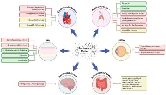 In addition to turmeric and DOWE, other plant extracts and phytochemicals are being investigated for their protective effects against PM-related health risks across various systems, offering a more comprehensive understanding of their mechanisms and potential applications, which are categorized by system in the sections below.