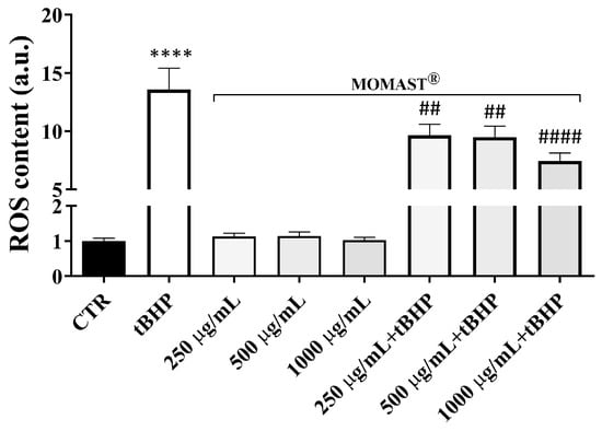 MOMAST® displays several protective actions on inflammatory and oxidative stress signal transduction pathways [17,20,21]. Here, the antioxidant effect of MOMAST® was evaluated in HCT8 cells. Cells were treated at increasing concentrations with MOMAST® (250, 500, and 1000 µg/mL overnight) in the absence or in the presence of tBHP which was used as an internal positive control (Figure 1). Compared to the positive control, exposure to MOMAST® resulted in a significant reduction in tBHP-induced ROS levels indicating its antioxidant capacity (Supplementary Materials, Table S1). Treatment with MOMAST® alone did not alter the intracellular ROS levels compared to untreated cells (CTR).