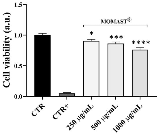 Cell viability in HCT8 cells exposed to MOMAST®. Cells were left under basal conditions or exposed to increasing concentrations (250, 500, and 1000 µg/mL) of MOMAST® as described in Methods. As a positive internal control, cells were treated with 90% ethanol for 1 min (CTR+). Data are shown as means ± Standard Error Means (S.E.M.) of seven independent experiments and analyzed with one-way ANOVA followed by Dunnett’s multiple comparisons test (* p < 0.05 vs. CTR; *** p < 0.001 vs. CTR; **** p < 0.0001 vs. CTR).