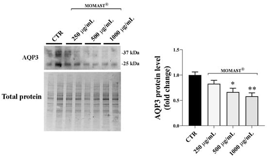 Western Blotting studies were therefore performed to evaluate the possible action of MOMAST® on AQP3 protein expression (Figure 4). To this end, HCT8 cells were left untreated or incubated as previously mentioned. Western blotting (left panel) and densitometric analysis (right panel) showed that treatments with MOMAST® significantly reduced the AQP3 protein expression compared to the untreated condition (Figure 4; CTR: 1.00 ± 0.06; MOMAST® 250 µg/mL: 0.83 ± 0.07; MOMAST® 500 µg/mL: 0.66 ± 0.07 **; MOMAST® 1000 µg/mL: 0.58 ± 0.07 ***; ** p < 0.01 vs. CTR, *** p < 0.001 vs. CTR, n = five independent experiments).
