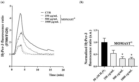 Live-cell imaging of changes in HyPer-3 fluorescence in HCT8 cells. (a) Representative traces showing the HyPer-3 fluorescence ratio in HCT8 cells treated with MOMAST®. (b) The histogram shows the normalized HyPer-3 fluorescence ratio where the normalized HyPer-3 ratio was calculated by evaluating the fluorescence ratio at the peak compared to the starting fluorescence values. Data are shown as means ± Standard Error Means (S.E.M.) of five independent experiments and analyzed by one-way ANOVA followed by Dunnett’s multiple comparisons test (* p < 0.05 vs. 50 µM H2O2).