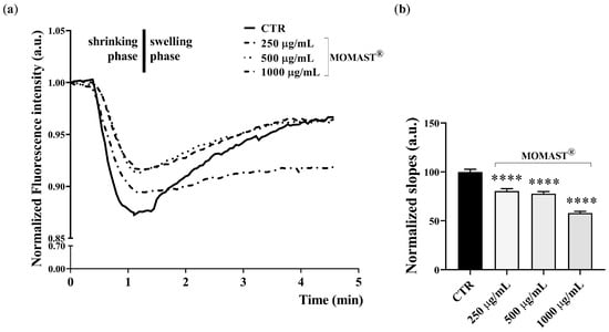 Effect of MOMAST® on glycerol permeability. (a) Representative time courses of cell shrinking (water exit) followed by cell swelling indicative of the osmotic influx of water promoted by glycerol entry along its gradient (Δ 100 mOsm/L). (b) A bar plot showing the means ± Standard Error Means (S.E.M.) values of the cell swelling time constants (slope) reflecting glycerol entry into the cells. Data are obtained from 91 different measurements of 4 independent experiments. A one-way ANOVA and Dunnett’s Multiple Comparison test were performed (**** p < 0.0001 vs. CTR).