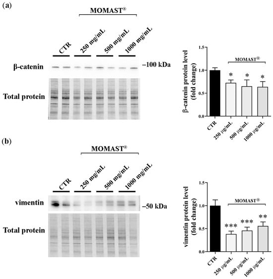 EMT is a complex mechanism that contributes to cancer development. Marker proteins including vimentin and β-catenin may be useful as prognostic biomarkers. Recent data revealed that the upregulation of AQP3 expression is paralleled with EMT-associated proteins resulting in a poor prognosis of gastric cancer [5]. Therefore, Western Blotting studies were carried out to evaluate the effect of MOMAST® on EMT-related proteins. Cell lysates were immunoblotted using selective antibodies specific to detect vimentin and β-catenin. Obtained data (Figure 9) revealed that treatment with MOMAST® significantly reduced the abundance of vimentin and β-catenin compared to that measured in the lysates isolated from untreated cells. On the other hand, the expression of E-cadherin was not affected by the treatment with MOMAST® (Supplementary Materials, Figure S2).