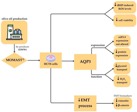 Model depicting the effects of MOMAST® exerted in HCT8 cells. Specifically, MOMAST®-reduced AQP3 expression and function and affect the expression level of the EMT protein markers, vimentin and β-catenin. The downward arrow indicates a reduction.
