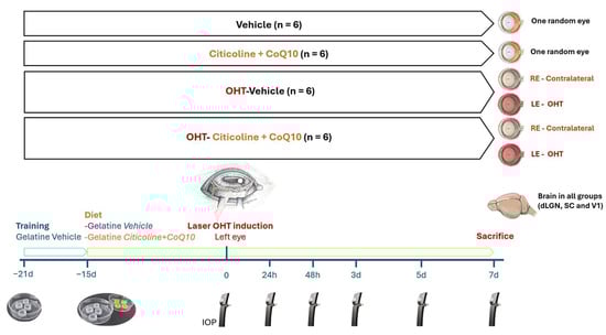 The combined administration of citicoline and CoQ10 was delivered orally via 1 gelatine/day of 0.5 mL, prepared in our laboratory using commercial gelatin (gelatin from porcine skin, Sigma-Aldrich G2500-500G, St. Louis, MO, USA) and potable water. For the animals receiving treatment, the gelatin contained citicoline (Neurotidine®, Omikron Pharmaceutical España S.L.U., Barcelona, Spain) (500 mg/kg) and CoQ10 (COQUN® OS, VISUfarma B.V., Madrid, Spain) (200 mg/kg). The combination (citicoline + CoQ10) is commercialized as COQUN Combo (COQUN® combo, VISUfarma S.p.A., Rome, Italy). The daily doses of both compounds were calculated based on previous studies [,,,], with an average animal weight of 40 g as a reference. The animals in the control group were administered only gelatin as a vehicle. The administration of gelatin (with or without the compound) began 15 days prior to the induction of OHT and continued until the designated sacrifice points (7 days post-OHT induction). This administration period was selected based on the study by Fernández-Albarral et al., 2019 []. To ensure the compound was fully ingested by the animals, the person responsible for administering the gelatin monitored them until it was completely consumed.