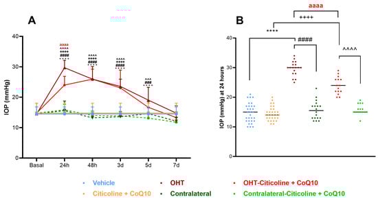 Intraocular pressure (IOP) graphics. (A) IOP in different study groups after induction of hypertension. (B) IOP data in the different study groups 24 h after induction. Data are mean ± s.e.m.; each data point denotes an individual measure of the IOP. Abbreviations: ocular hypertension (OHT); coenzyme Q10 (CoQ10). Statistical significance indicators: **** p < 0.0001 vehicle vs. OHT; ++++ p < 0.0001 citicoline + CoQ10 vs. OHT–citicoline + CoQ10; ### p < 0.001, #### p < 0.0001 OHT vs. contralateral; ^^^ p < 0.001, ^^^^ p < 0.0001 OHT–citicoline + CoQ10 vs. contralateral–citicoline + CoQ10; aaaa p < 0.0001 for OHT vs. OHT–citicoline + CoQ10.