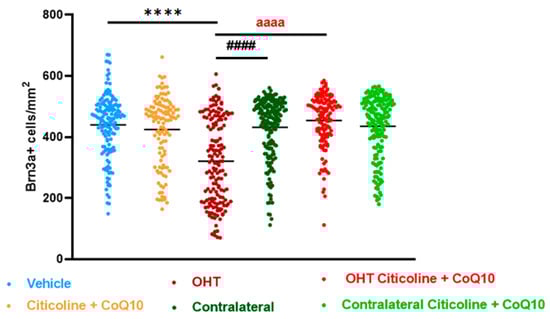 Comparison of total number of Brn3a+ retinal ganglion cells (RGCs) in the different study groups treated with the combination of citicoline and CoQ10 or with vehicle 7 days after OHT induction. Data are mean ± s.e.m.; each data point denotes an individual measure of the Brn3a + RGCs per area of 0.1502 mm2. Abbreviations: ocular hypertension (OHT); coenzyme Q10 (CoQ10). Statistical significance indicators: **** p < 0.0001 vehicle vs. OHT; #### p < 0.0001 OHT vs. contralateral; aaaa p < 0.0001 for OHT vs. OHT–citicoline + CoQ10.