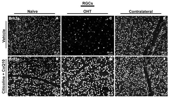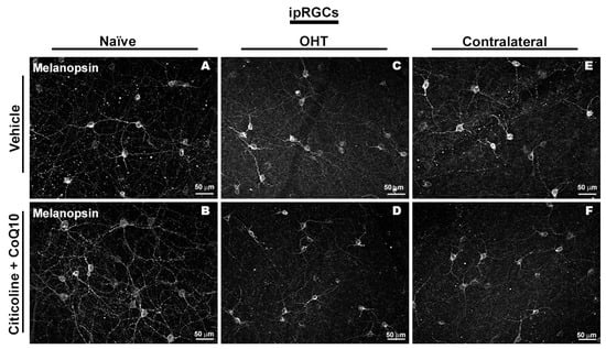 Before studying the effects of the combination of citicoline and CoQ10 on the number of RGCs and ipRGCs after OHT laser induction, we first compared vehicle and citicoline + CoQ10 eyes by counting the number of these cells. The results did not show significant differences between the two groups (Figure 3).