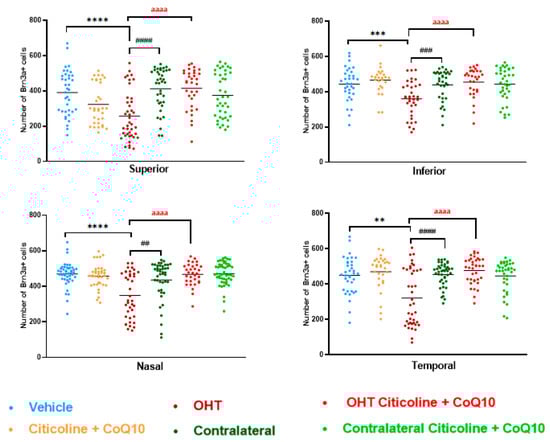 Comparison of number of Brn3a+ retinal ganglion cells (RGCs) in the four retinal sectors, superior, inferior, nasal, and temporal, in the different study groups 7 days after OHT induction. Data are mean ± s.e.m.; each data point denotes an individual measure of the Brn3a + RGCs per area of 0.1502 mm2. Abbreviations: ocular hypertension group (OHT); coenzyme Q10 (CoQ10). Statistical significance indicators: ** p < 0.01, *** p < 0.001, **** p < 0.0001 vehicle vs. OHT; ## p < 0.01, ### p < 0.001, #### p < 0.0001 OHT vs. contralateral; aaaa p < 0.0001 OHT vs. OHT–citicoline + CoQ10.