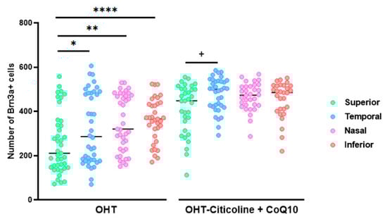 Comparison of the number of Brn3a+ retinal ganglion cells (RGCs) in untreated and citicoline and CoQ10-treated hypertensive eyes in the four retinal sectors, superior, temporal, nasal and inferior, 7 days after OHT induction. Data are mean ± s.e.m.; each data point denotes an individual measure of the Brn3a + RGCs per area of 0.1502 mm2. Abbreviations: ocular hypertension (OHT); coenzyme Q10 (CoQ10). Statistical significance indicators: In OHT group: * p < 0.05 for superior vs. temporal, ** p < 0.01 superior vs. nasal, **** p < 0.0001 superior vs. inferior. In OHT–citicoline + CoQ10 group: + p < 0.05 superior vs. temporal.
