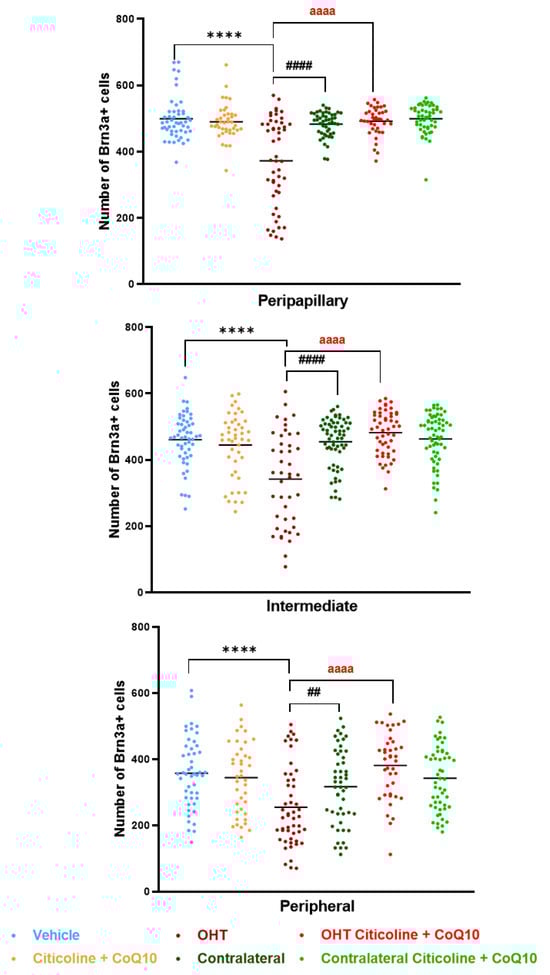 Comparison of number of Brn3a+ retinal ganglion cells (RGCs) in the three retinal areas, peripapillary, intermediate, and peripheral, in the different study groups 7 days after OHT induction. Data are mean ± s.e.m.; each data point denotes an individual measure of the Brn3a + RGCs per area of 0.1502 mm2. Abbreviations: ocular hypertension group (OHT); coenzyme Q10 (CoQ10). Statistical significance indicators: **** p < 0.0001 vehicle vs. OHT; ## p < 0.01, #### p < 0.0001 OHT vs. contralateral; aaaa p < 0.0001 OHT vs. OHT–citicoline + CoQ10.