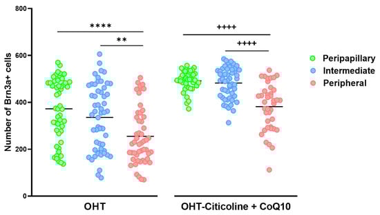 When comparing the number of Brn3a+ cells in different zones (peripapillary, intermediate, and peripheral) in OHT eyes, a decrease was observed in the peripheral zone compared to the peripapillary zone (p < 0.0001) and the intermediate zone (p < 0.01). This distribution is also observed in OHT eyes treated with citicoline + CoQ10 (peripheral vs. peripapillary and peripheral vs. intermediate; p < 0.0001 in both cases). The difference between untreated and treated OHT eyes is that the number of Brn3a+ RGCs is higher in all zones in animals treated with citicoline + CoQ10 due to the prevention of RGC loss (Figure 8).
