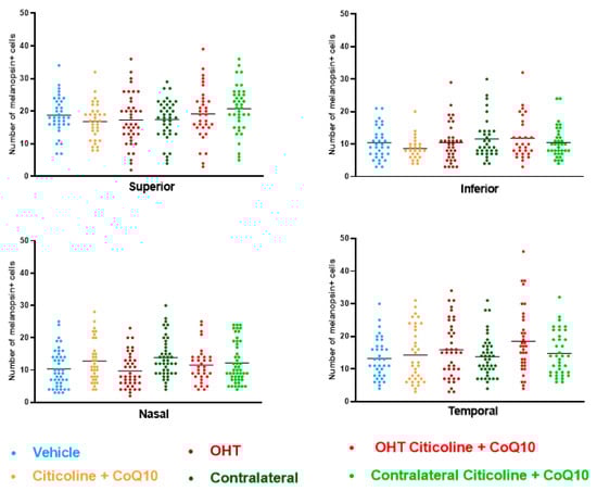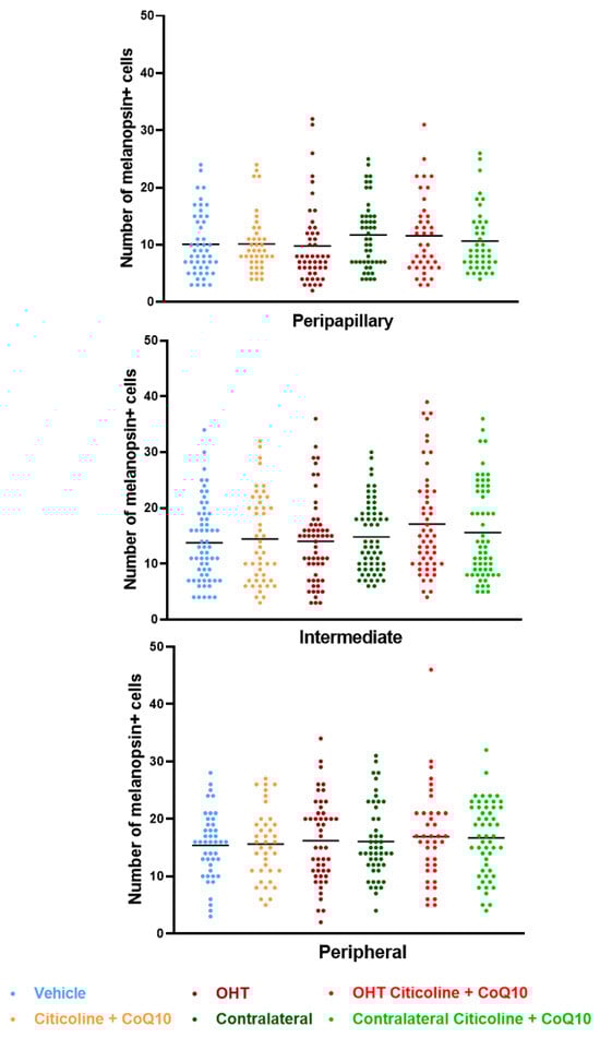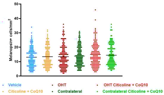 Regarding the number of melanopsin+ ipRGCs, no significant differences were found between the different groups (vehicle, citicoline + CoQ10, OHT, OHT–citicoline + CoQ10, contralateral, and contralateral–citicoline + CoQ10) in either the total retina (Figure 9 and Figure 10), the sectoral analysis (Figure 11), or the area analysis (Figure 12). This indicates that in OHT and OHT–citicoline + CoQ10 eyes there was no loss of melanopsin+ ipRGCs.