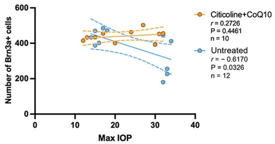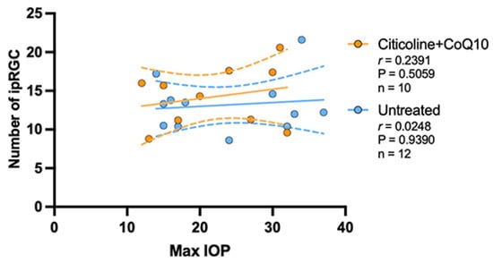 The correlation between the maximum value of IOP and the number of RGCs was analyzed in the untreated groups and the citicoline + CoQ10-treated groups.
