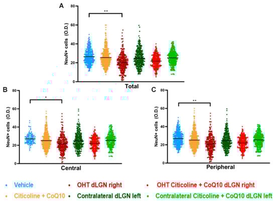 Analysis of NeuN+ cells (OD) of the dorsolateral geniculate nucleus in the total (A), central zone (B), and peripheral zone (C) in the different study groups 7 days after ocular hypertension induction. Data are mean ± s.e.m.; each data point denotes an individual measure of the NeuN+ cells (OD). Abbreviations: ocular hypertension group (OHT); coenzyme Q10 (CoQ10). Statistical significance indicators: * p < 0.05, ** p < 0.01 for vehicle vs. OHT dLGN right.