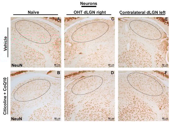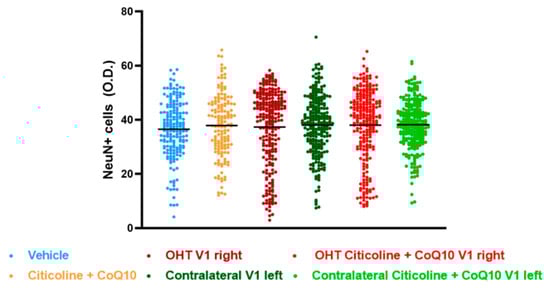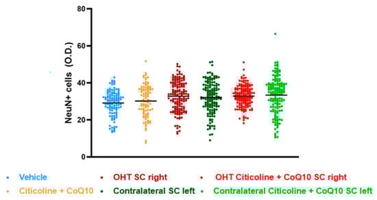 For the visual pathway study, the statistical significance among the groups vehicle, citicoline + CoQ10, OHT dLGN right, contralateral dLGN left, OHT–citicoline + CoQ10dLGN right, and contralateral citicoline + CoQ10dLGN left was assessed using the Mann–Whitney U test for unpaired data or the Wilcoxon signed-rank test for comparisons between left and right hemispheres. The following parameters were compared: (i) expression of Neu-N+ cells. A p-value of <0.05 was considered statistically significant.